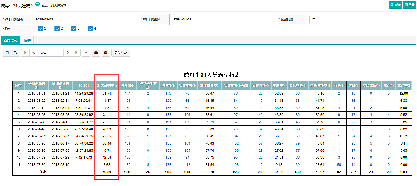 通過(guò)指標(biāo)數(shù)據(jù)對(duì)關(guān)鍵管理環(huán)節(jié)加以評(píng)估和監(jiān)控,并與企業(yè)標(biāo)準(zhǔn)和行業(yè)標(biāo)準(zhǔn)進(jìn)行對(duì)比,根據(jù)數(shù)據(jù)的差異可以幫助管理者及時(shí)發(fā)現(xiàn)問題,防微杜漸,以保證牧場(chǎng)的生產(chǎn)經(jīng)營(yíng)持續(xù)、穩(wěn)定、健康地發(fā)展,如21天妊娠率的指標(biāo)監(jiān)控。下圖是奶業(yè)之星?牧場(chǎng)管理信息系統(tǒng)對(duì)牧場(chǎng)21天妊娠率的監(jiān)控?cái)?shù)據(jù)。
